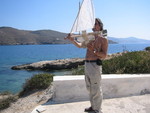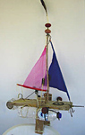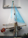 2005model sailing ship made from stuff washed ashore I found on beaches all over the world. sails, keel, rudder and masts adjustable. Some can be reefed. Made on the spot and put to the open sea after very enjoyable sea trials. They work. I wonder where they finally ended up....